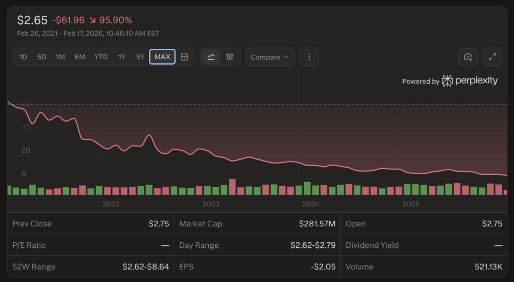 Bumble’s total company value has fallen from roughly $13 billion at its peak to roughly $400 million today. That’s a 97% destruction of shareholder value. The stock trades around $3.22 per share.