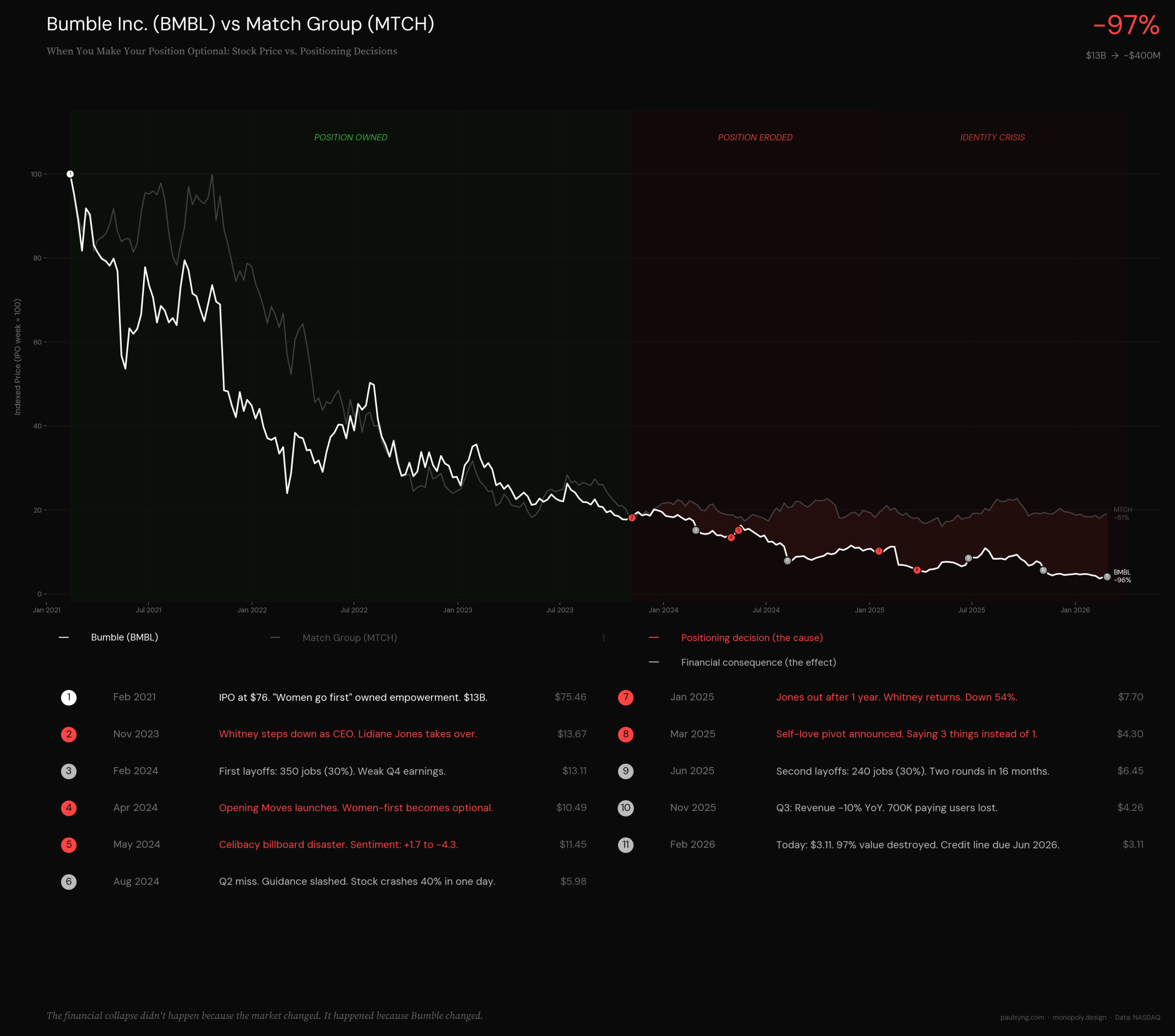The financial data doesn’t explain why Bumble is failing. The positioning collapse explains that. But the numbers show how urgent this is.
