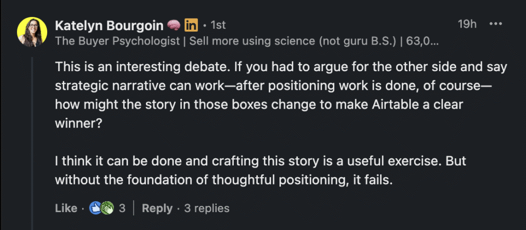 Sara’s seeing companies with no position trying to use narrative as a substitute. That doesn’t work. But concluding “narrative doesn’t work” is like watching someone use a hammer wrong and concluding hammers don’t work.